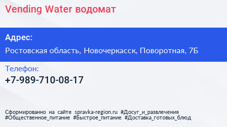 Vending Water, водомат по адресу Ростовская область, Новочеркасск, Поворотная, 7Б в дальнейшем Организация, размещена в следующих категориях: