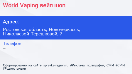 World Vaping, вейп-шоп по адресу Ростовская область, Новочеркасск, Николаевой-Терешковой, 7 в дальнейшем Организация, размещена в следующих категориях:
