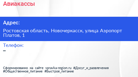 Авиакассы по адресу Ростовская область, Новочеркасск, улица Аэропорт Платов, 1 в дальнейшем Организация, размещена в следующих категориях: