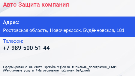 Авто Защита, компания по адресу Ростовская область, Новочеркасск, Будённовская, 181 в дальнейшем Организация, размещена в следующих категориях: