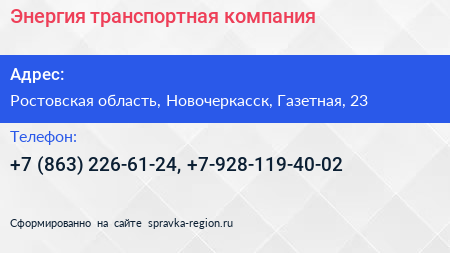 Энергия, транспортная компания по адресу Ростовская область, Новочеркасск, Газетная, 23 в дальнейшем Организация, размещена в следующих категориях: