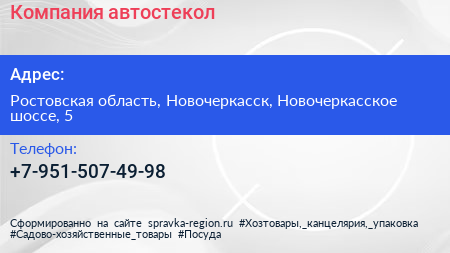 Компания автостекол по адресу Ростовская область, Новочеркасск, Новочеркасское шоссе, 5 в дальнейшем Организация, размещена в следующих категориях: