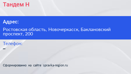 Тандем-Н по адресу Ростовская область, Новочеркасск, Баклановский проспект, 200 в дальнейшем Организация, размещена в следующих категориях: