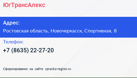 ЮгТрансАлекс по адресу Ростовская область, Новочеркасск, Спортивная, 8 в дальнейшем Организация, размещена в следующих категориях: