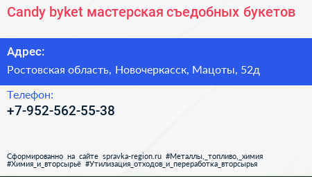 Candy byket, мастерская съедобных букетов по адресу Ростовская область, Новочеркасск, Мацоты, 52д в дальнейшем Организация, размещена в следующих категориях: