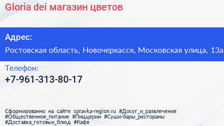 Gloria dei, магазин цветов по адресу Ростовская область, Новочеркасск, Московская улица, 13а в дальнейшем Организация, размещена в следующих категориях: