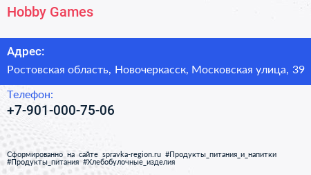 Hobby Games по адресу Ростовская область, Новочеркасск, Московская улица, 39 в дальнейшем Организация, размещена в следующих категориях:
