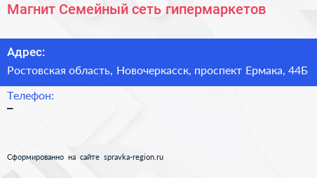 Магнит Семейный, сеть гипермаркетов по адресу Ростовская область, Новочеркасск, проспект Ермака, 44Б в дальнейшем Организация, размещена в следующих категориях: