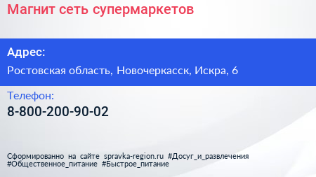 Магнит, сеть супермаркетов по адресу Ростовская область, Новочеркасск, Искра, 6 в дальнейшем Организация, размещена в следующих категориях: