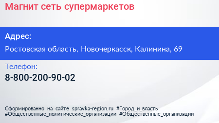 Магнит, сеть супермаркетов по адресу Ростовская область, Новочеркасск, Калинина, 69 в дальнейшем Организация, размещена в следующих категориях: