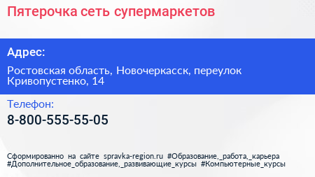 Пятерочка, сеть супермаркетов по адресу Ростовская область, Новочеркасск, переулок Кривопустенко, 14 в дальнейшем Организация, размещена в следующих категориях: