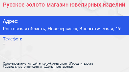 Русское золото, магазин ювелирных изделий по адресу Ростовская область, Новочеркасск, Энергетическая, 19 в дальнейшем Организация, размещена в следующих категориях: