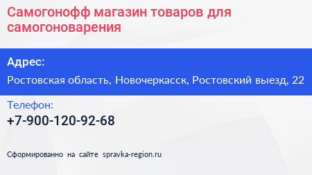 Самогонофф, магазин товаров для самогоноварения по адресу Ростовская область, Новочеркасск, Ростовский выезд, 22 в дальнейшем Организация, размещена в следующих категориях: