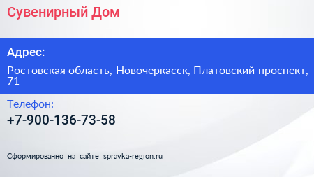 Сувенирный Дом по адресу Ростовская область, Новочеркасск, Платовский проспект, 71 в дальнейшем Организация, размещена в следующих категориях: