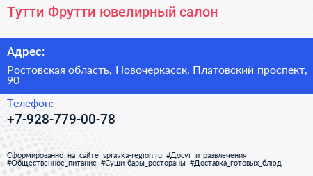 Тутти-Фрутти, ювелирный салон по адресу Ростовская область, Новочеркасск, Платовский проспект, 90 в дальнейшем Организация, размещена в следующих категориях: