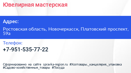 Ювелирная мастерская по адресу Ростовская область, Новочеркасск, Платовский проспект, 59а в дальнейшем Организация, размещена в следующих категориях: