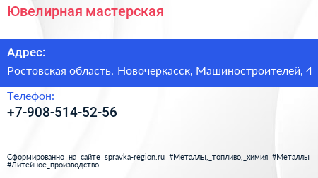 Ювелирная мастерская по адресу Ростовская область, Новочеркасск, Машиностроителей, 4 в дальнейшем Организация, размещена в следующих категориях: