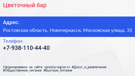 Цветочный бар по адресу Ростовская область, Новочеркасск, Московская улица, 31 в дальнейшем Организация, размещена в следующих категориях: