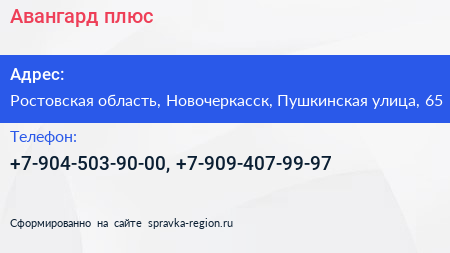 Авангард плюс по адресу Ростовская область, Новочеркасск, Пушкинская улица, 65 в дальнейшем Организация, размещена в следующих категориях: