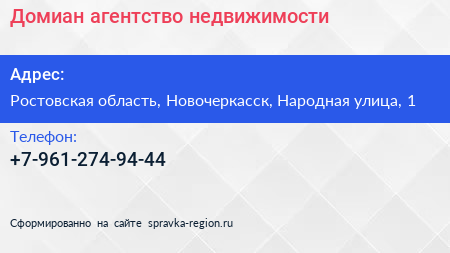 Домиан, агентство недвижимости по адресу Ростовская область, Новочеркасск, Народная улица, 1 в дальнейшем Организация, размещена в следующих категориях: