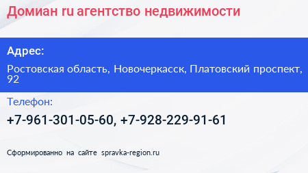 Домиан.ru, агентство недвижимости по адресу Ростовская область, Новочеркасск, Платовский проспект, 92 в дальнейшем Организация, размещена в следующих категориях: