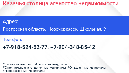 Казачья столица, агентство недвижимости по адресу Ростовская область, Новочеркасск, Школьная, 9 в дальнейшем Организация, размещена в следующих категориях: