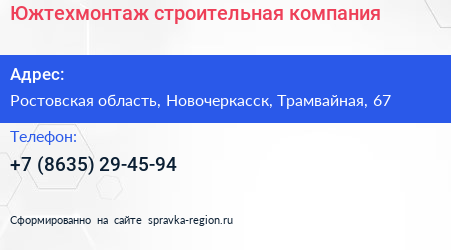 Южтехмонтаж, строительная компания по адресу Ростовская область, Новочеркасск, Трамвайная, 67 в дальнейшем Организация, размещена в следующих категориях: