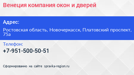 Венеция, компания окон и дверей по адресу Ростовская область, Новочеркасск, Платовский проспект, 75а в дальнейшем Организация, размещена в следующих категориях: