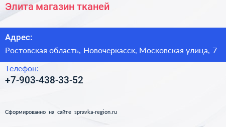 Элита, магазин тканей по адресу Ростовская область, Новочеркасск, Московская улица, 7 в дальнейшем Организация, размещена в следующих категориях: