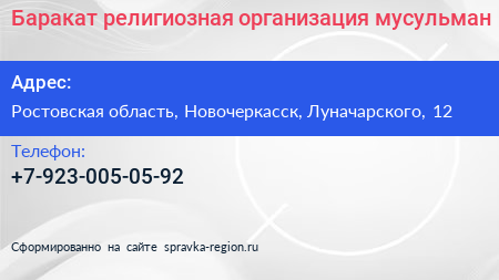 Баракат, религиозная организация мусульман по адресу Ростовская область, Новочеркасск, Луначарского, 12 в дальнейшем Организация, размещена в следующих категориях: