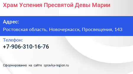 Храм Успения Пресвятой Девы Марии по адресу Ростовская область, Новочеркасск, Просвещения, 143 в дальнейшем Организация, размещена в следующих категориях: