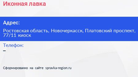 Иконная лавка по адресу Ростовская область, Новочеркасск, Платовский проспект, 77/11 киоск в дальнейшем Организация, размещена в следующих категориях: