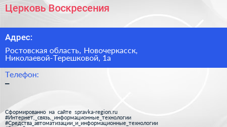Церковь Воскресения по адресу Ростовская область, Новочеркасск, Николаевой-Терешковой, 1а в дальнейшем Организация, размещена в следующих категориях: