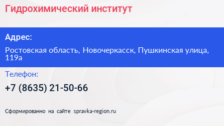 Гидрохимический институт по адресу Ростовская область, Новочеркасск, Пушкинская улица, 119а в дальнейшем Организация, размещена в следующих категориях: