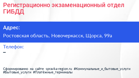 Регистрационно-экзаменационный отдел ГИБДД по адресу Ростовская область, Новочеркасск, Щорса, 99а в дальнейшем Организация, размещена в следующих категориях: