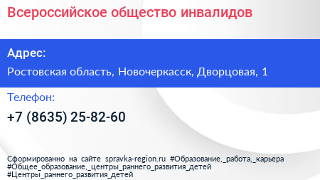Всероссийское общество инвалидов по адресу Ростовская область, Новочеркасск, Дворцовая, 1 в дальнейшем Организация, размещена в следующих категориях: