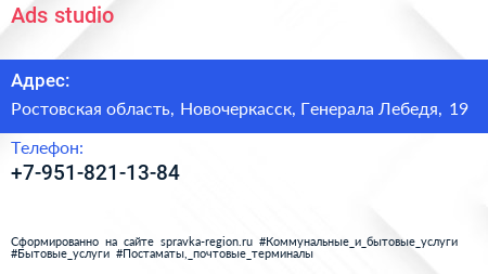 Ads studio по адресу Ростовская область, Новочеркасск, Генерала Лебедя, 19 в дальнейшем Организация, размещена в следующих категориях: