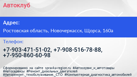 Автоклуб по адресу Ростовская область, Новочеркасск, Щорса, 160а в дальнейшем Организация, размещена в следующих категориях: