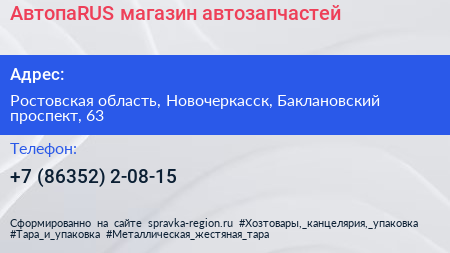 АвтопаRUS, магазин автозапчастей по адресу Ростовская область, Новочеркасск, Баклановский проспект, 63 в дальнейшем Организация, размещена в следующих категориях: