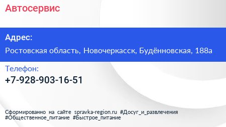 Автосервис по адресу Ростовская область, Новочеркасск, Будённовская, 188а в дальнейшем Организация, размещена в следующих категориях: