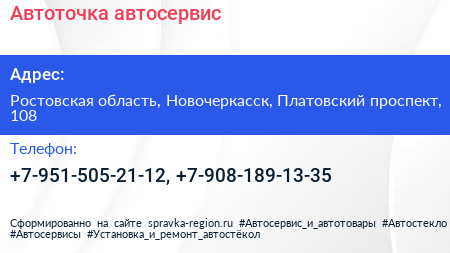 Автоточка, автосервис по адресу Ростовская область, Новочеркасск, Платовский проспект, 108 в дальнейшем Организация, размещена в следующих категориях: