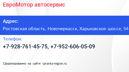 ЕвроМотор, автосервис по адресу Ростовская область, Новочеркасск, Харьковское шоссе, 54 в дальнейшем Организация, размещена в следующих категориях: