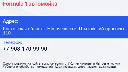 Formula 1, автомойка по адресу Ростовская область, Новочеркасск, Платовский проспект, 110 в дальнейшем Организация, размещена в следующих категориях:
