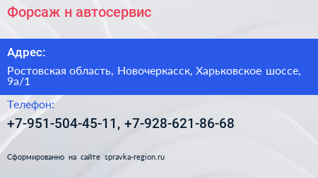 Форсаж-н, автосервис по адресу Ростовская область, Новочеркасск, Харьковское шоссе, 9а/1 в дальнейшем Организация, размещена в следующих категориях: