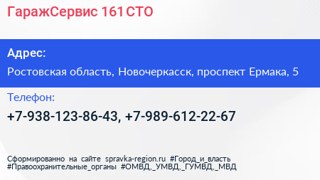 ГаражСервис 161, СТО по адресу Ростовская область, Новочеркасск, проспект Ермака, 5 в дальнейшем Организация, размещена в следующих категориях: