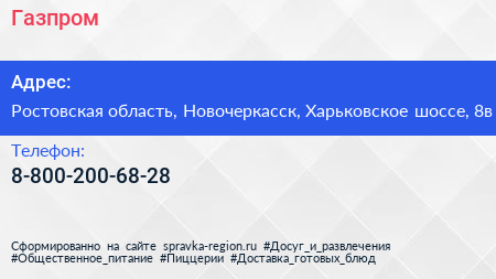 Газпром по адресу Ростовская область, Новочеркасск, Харьковское шоссе, 8в в дальнейшем Организация, размещена в следующих категориях:
