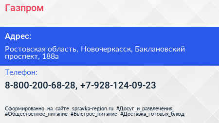 Газпром по адресу Ростовская область, Новочеркасск, Баклановский проспект, 188а в дальнейшем Организация, размещена в следующих категориях: