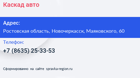 Каскад авто по адресу Ростовская область, Новочеркасск, Маяковского, 60 в дальнейшем Организация, размещена в следующих категориях: