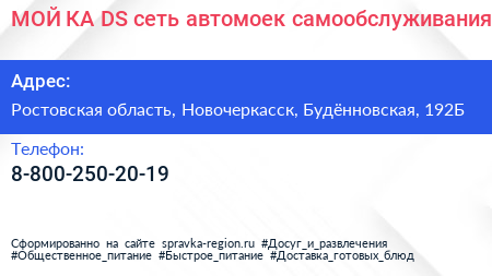 МОЙ-КА! DS, сеть автомоек самообслуживания по адресу Ростовская область, Новочеркасск, Будённовская, 192Б в дальнейшем Организация, размещена в следующих категориях: