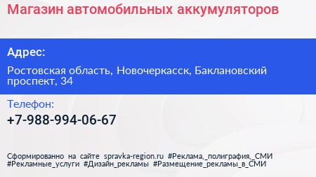 Магазин автомобильных аккумуляторов по адресу Ростовская область, Новочеркасск, Баклановский проспект, 34 в дальнейшем Организация, размещена в следующих категориях: